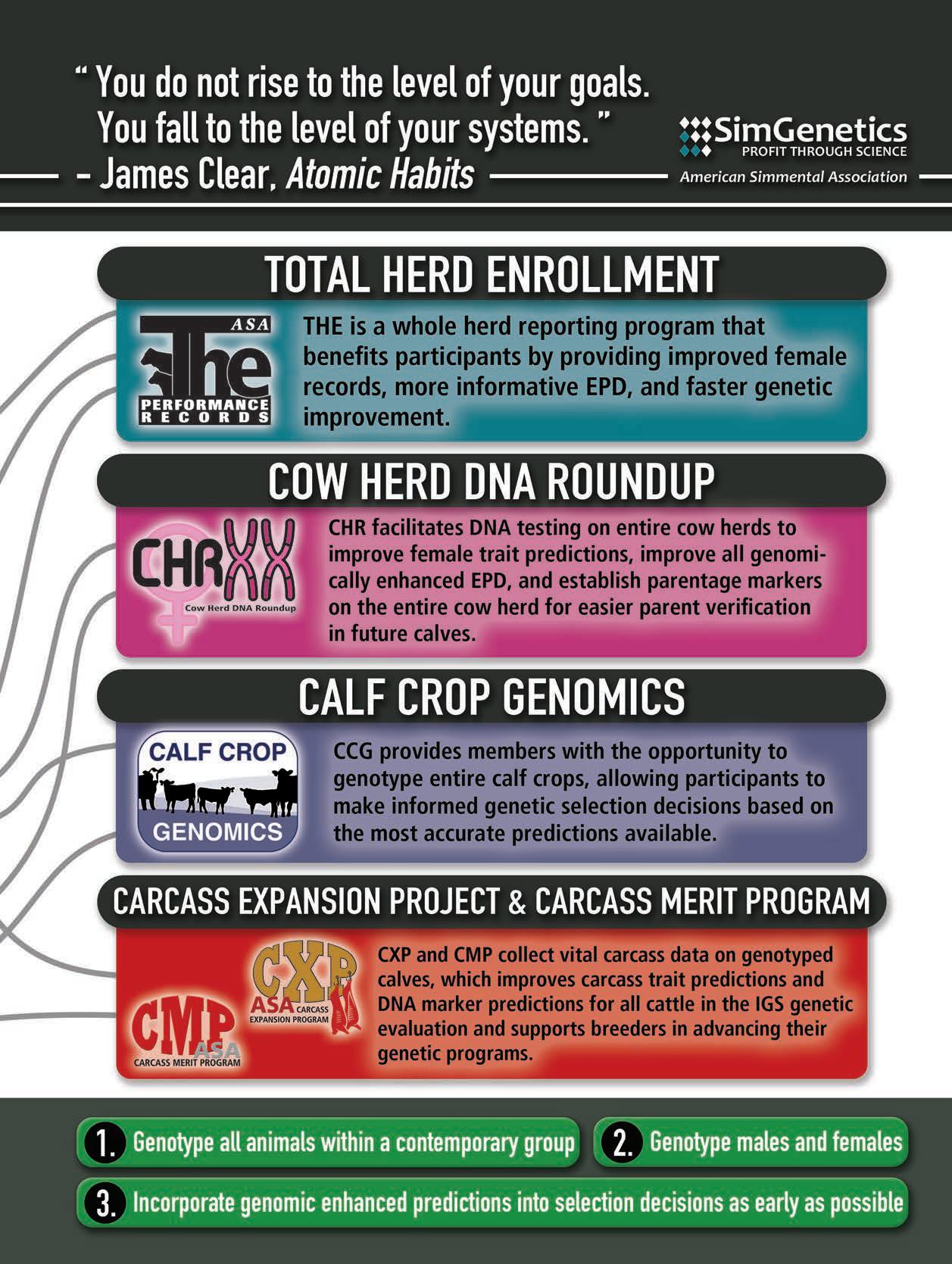Looking to test your top young sire across different environments? Want to enhance accuracy and gain valuable data on your young sire? The Carcass Merit Program (CMP) is for you! Since 1997, the CMP has relied on select cooperator herds to test sires; however, ASA recently added a new CMP testing avenue, which will allow for MORE SIRES to be tested annually. CMP collects vital carcass data on calves, which improves carcass trait predictions and DNA marker predictions for all cattle in the IGS genetic evaluation, and supports breeders in evaluating their young sires and advancing their genetic programs. If you’re interested in nominating a sire, fill out the nomination form at simmental.org (Programs, ASA Programs, CMP).