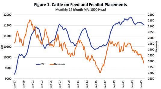 Total feedlot production is declining more rapidly than the slowly declining feedlot inventories would indicate. Feedlot placements in August were 90.1% of last year, and the smallest August placement total since 2015. Figure 1 shows the relative comparison between 12-month moving averages of cattle on-feed and feedlot placements. Placements have declined more than the on-feed inventory up to this point aided by a slower turnover rate in feedlots.