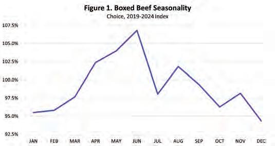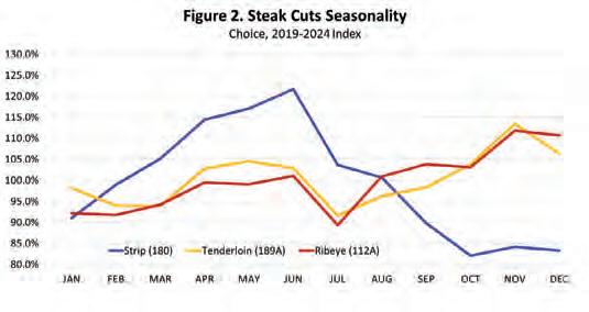 The boxed beef seasonal price pattern in Figure 1 is the net effect of many beef products included in the composite boxed beef measure. Across many beef products from the various carcass primals, different beef products have varied and unique seasonal price patterns reflecting different seasonal demands. While many beef product prices are increasing in the first half of the year, some products have lower prices early in the year and higher prices later in the year.