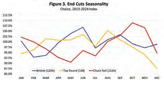 Figure 3 shows the seasonal price patterns for some end cuts and briskets. Brisket prices typically increase and peak in the second quarter with stronger summer demand. Round values have been very strong the last two years as a result of declining nonfed beef production and demand for additional lean. Round prices are typically strong from the second quarter through the third quarter as a result of seasonal ground beef demand. Prices for chuck rolls usually decrease into warmer weather. Chuck products have higher demand for roasts and crock pot cooking in cooler weather with prices reaching a seasonal peak in the fall. Chucks are also popular export items.