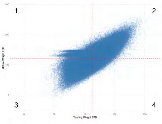 Animals in quadrant 2 have larger YW EPD and larger MW EPD, while animals in quadrant 3 have smaller YW EPD and smaller MW EPD. This follows the general relationship discussed above. Animals in quadrant 1 have lighter YW EPD, but larger MW EPD, which would typically be undesirable. Quadrant 4 animals have heavier YW EPD, but lighter MW EPD, which is typically seen as desirable. Animals in quadrant 4 would be those to select to maintain growth performance and moderate mature cow weight.