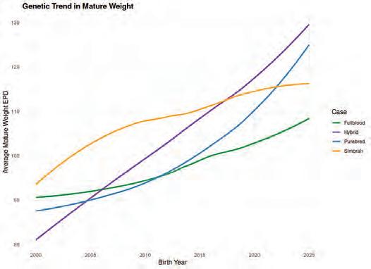 Cattle producers have put a large emphasis on selection for heavier weaning and yearling weights, which has led to substantial gains in those traits. Due to the strong relationship between these earlier in life weight traits and mature weight, this selection pressure has also led to increases in mature weight. The genetic trend of the MW EPD in the Simmental breed is shown in Figure 3. Despite having different average MW EPD in 2025 ranging from about 110 to 130, all four of the Simmental breed sub-groups (purebred, hybrid, Simbrah, and fullblood) have experienced an upward trend in MW EPD over the last 20 years.