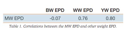 The MW EPD does not have a strong relationship with the BW EPD. In contrast, the MW EPD has a strong, positive correlation with both the WW EPD and YW EPD. This means that animals with higher WW and YW EPD also tend to have higher MW EPD. This correlation is strong, meaning this relationship holds true in most cases. However, because the correlations between these traits are less than one, it is possible to select and breed for animals that maintain growth performance while moderating mature cow weight. In other words, growth and mature size are related, but they can be managed independently with selection.