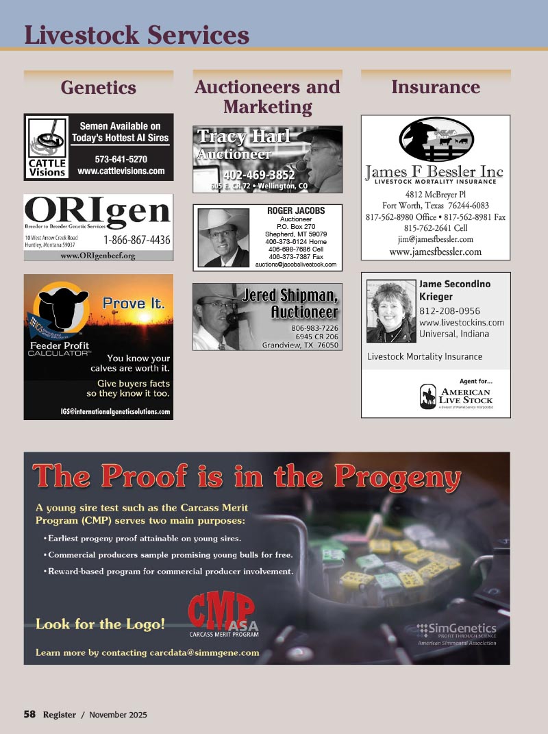 28 T-Heart Ranch’s High-Altitude Bull Sale — La Garita, CO (pg. 54)
